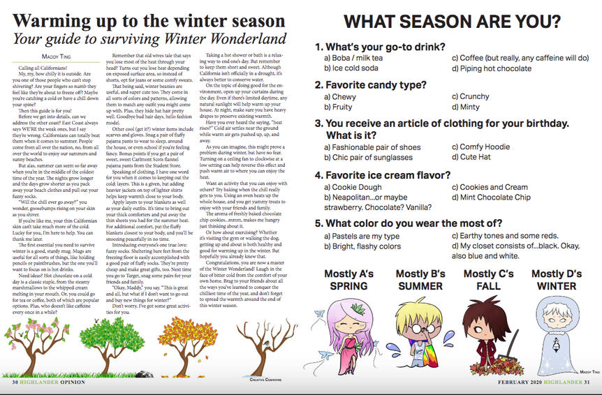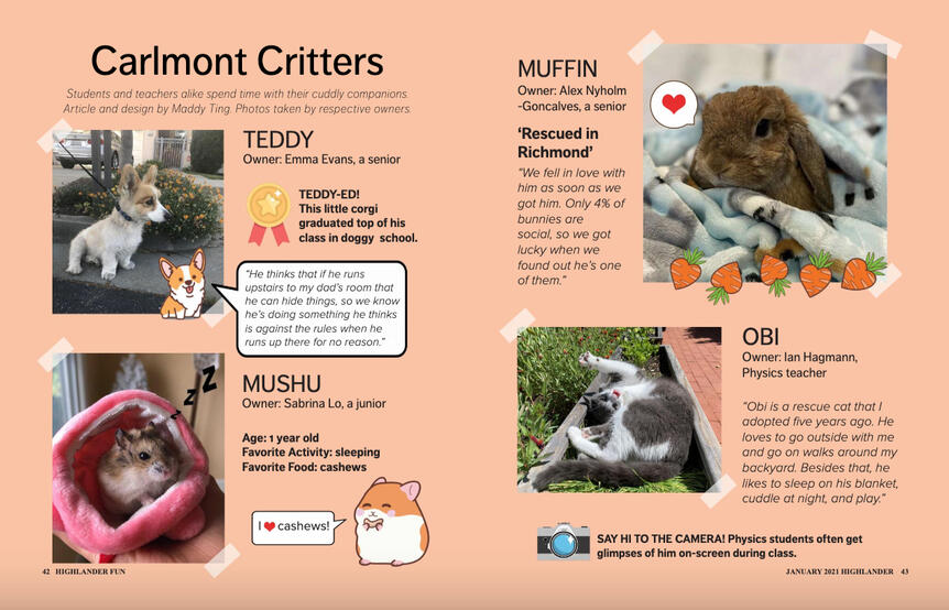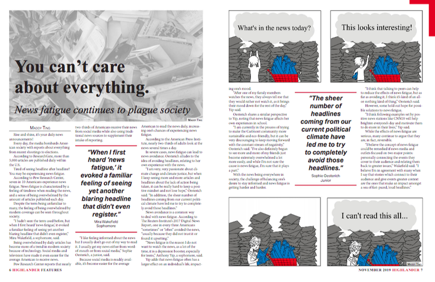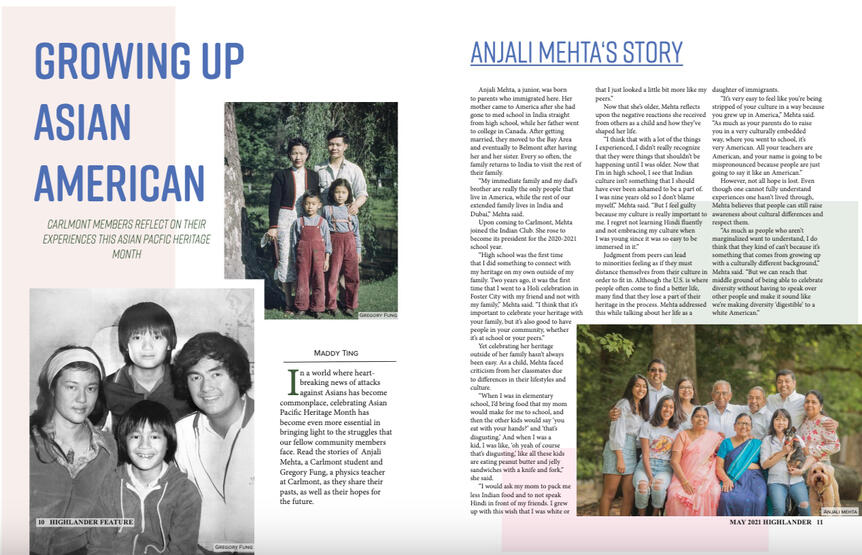 I've written features on exploring essential elements of American society as a Staff Writer for Carlmont's award-winning newsmagazine, The Highlander. I've also written for Scotlight, the highlighted section of the Highlander that tackles global and national issues in a student-friendly manner.